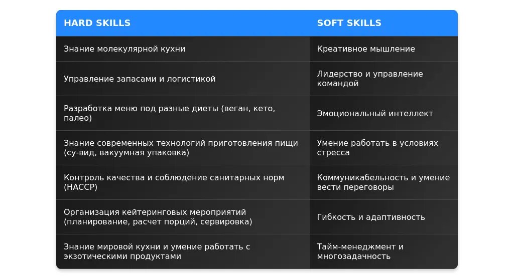 - Ключевые навыки (управление кухней, работа с командами).