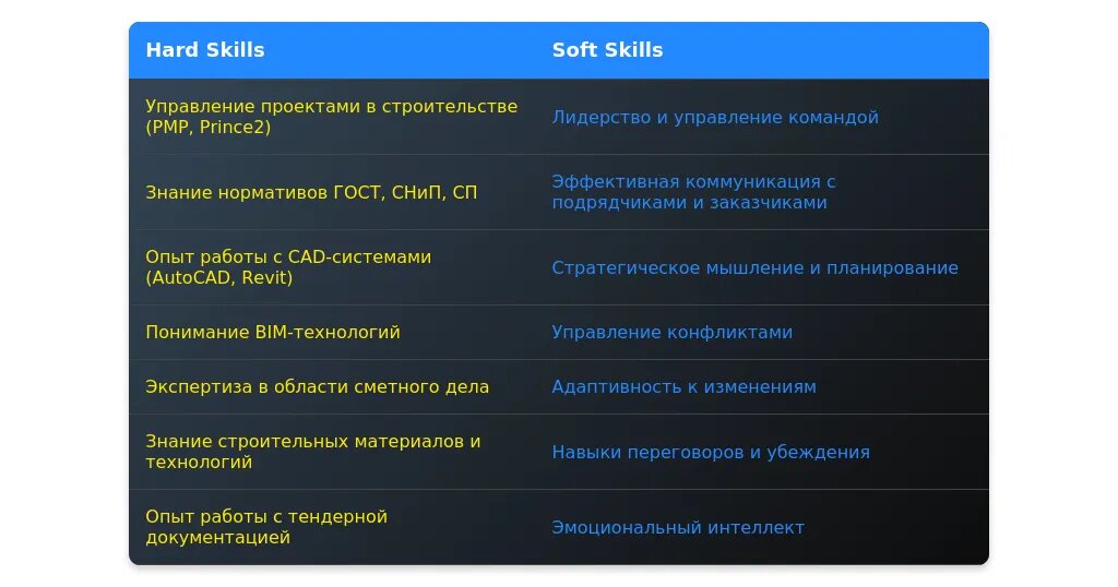 После адаптации: "Управление строительными проектами, знание СНИПов и ГОСТов, опыт работы в AutoCAD и Revit." Конкретика и акцент на ключевых навыках.