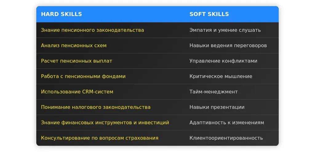 После адаптации: "Знание пенсионного законодательства, опыт работы с клиентами, навыки работы с CRM-системами."