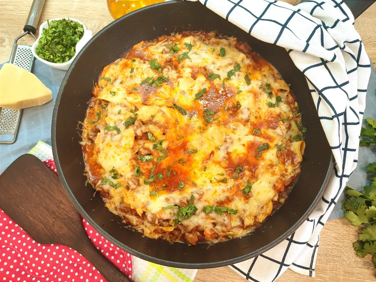 Вы любите лазанью? Я люблю, но готовится классическая лазанья Болоньезе не слишком то и быстро. Сначала нужно приготовить 2 соуса, затем собрать, запечь. К тому же, иногда остаётся 3-5 листов лазаньи - как говорится - ни туда и ни сюда 😁)).. Сегодня предлагаю ленивый вариант, всё в одной сковороде, быстро, вкусно, питательно!!! 1. Фарш у меня смешанный, свинина с говядиной, но в принципе, подойдёт любой. 2. В сковороду с разогретым маслом отправляем мелким кубиком нарезанный лук, обжариваем до прозрачности, добавляем морковь. 3. Через 2-3 минуты добавляем сельдерей, обжарим пару минут и выкладываем фарш, подрумяним немного, добавим чеснок. 4. В центре сковороды освободим немного места, обжарим томатную пасту, добавим специи, всё перемешаем, вливаем вино. 5. Протушим до испарения алкоголя. Вливаем примерно 1-1,5 стакана воды, так, чтобы немного скрыло фарш. Добавим зелень по вкусу и желанию, у меня листья сельдерея. 6. Беспорядочно ломаем листы лазаньи прямо в сковороду. 7. Аккуратно