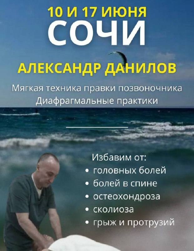 💥САМЫЙ ТЕПЛЫЙ ВЫЕЗДНОЙ ПРИЕМ 📍 Куда: Сочи 🗓️ Когда: 10 июня, 17 июня 👨🏼💼 Кто: Александр Данилов ☝🏻 С чем поможет: 🔸 Головные боли 🔸 Боль в спине, 🔸 Боль в суставах, 🔸 Нарушения работы внутренних органов. ✍️ Как записаться: + 7 (926) 495-29-42