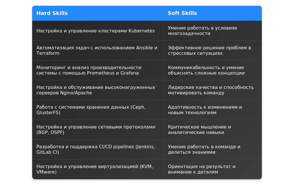 После адаптации: "Администрирование Linux (Red Hat, CentOS), автоматизация с использованием Ansible, настройка сетевых протоколов (TCP/IP, DNS, DHCP), работа с облачными сервисами (AWS, Azure)."