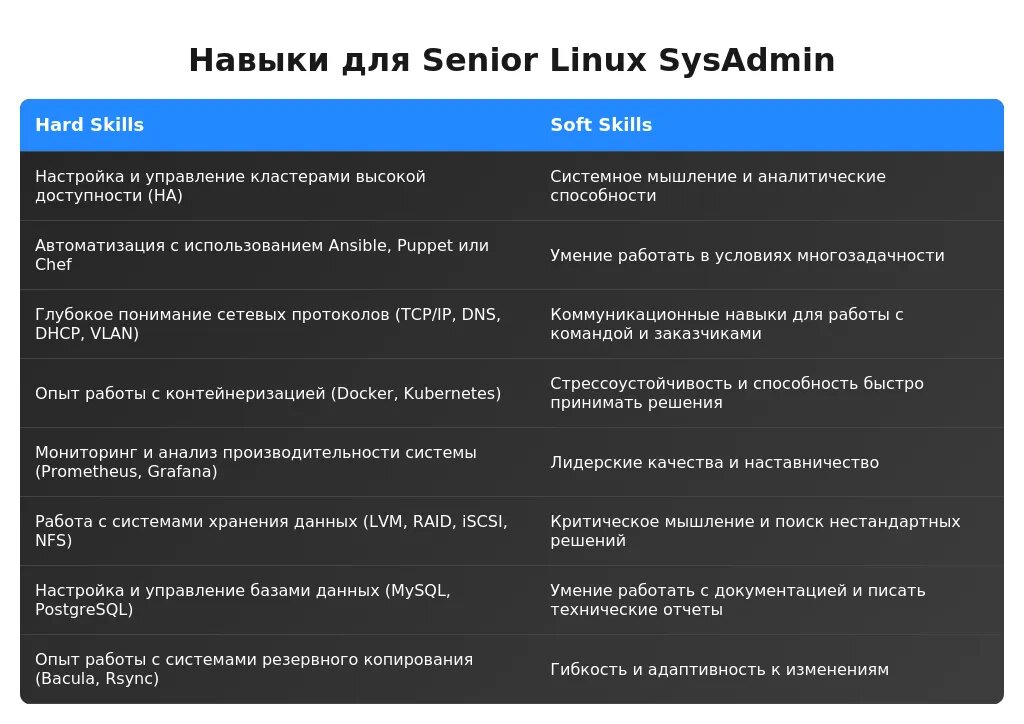 При анализе вакансии для старшего системного администратора Linux важно выделить ключевые требования, которые работодатель считает обязательными. Обращайте внимание на технические навыки, такие как управление серверами, настройка сетей, работа с базами данных, а также на требования к опыту работы и уровню ответственности. Обязательные требования обычно указываются в начале описания, а желательные — ближе к концу. Например, если в вакансии указано, что требуется опыт работы с Kubernetes или Ansible, это явный сигнал, что эти навыки будут использоваться регулярно.
