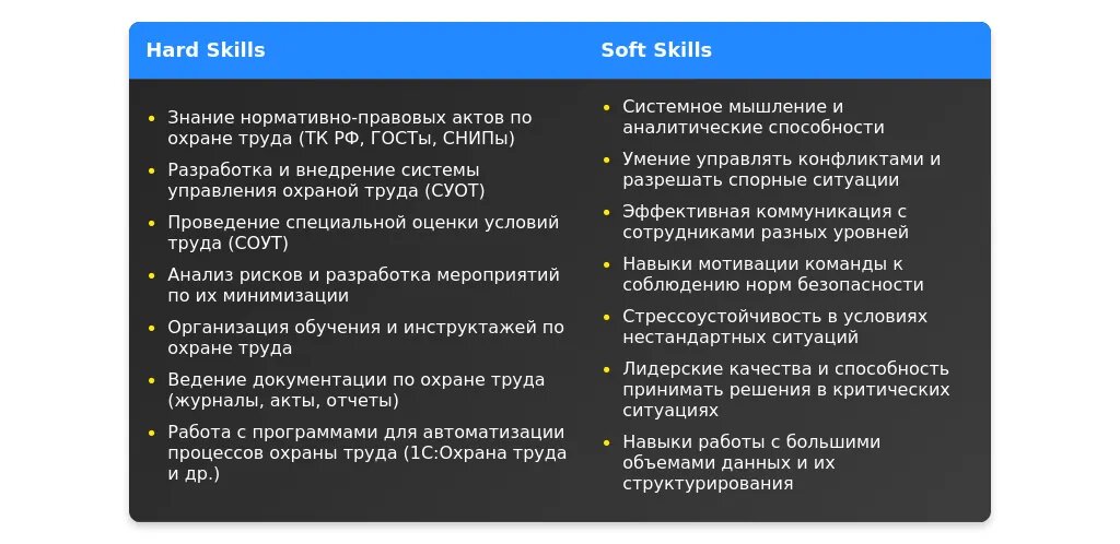 Пример 3: "Контроль за соблюдением требований охраны труда на объектах" — требуется знание нормативов и умение работать с документацией.