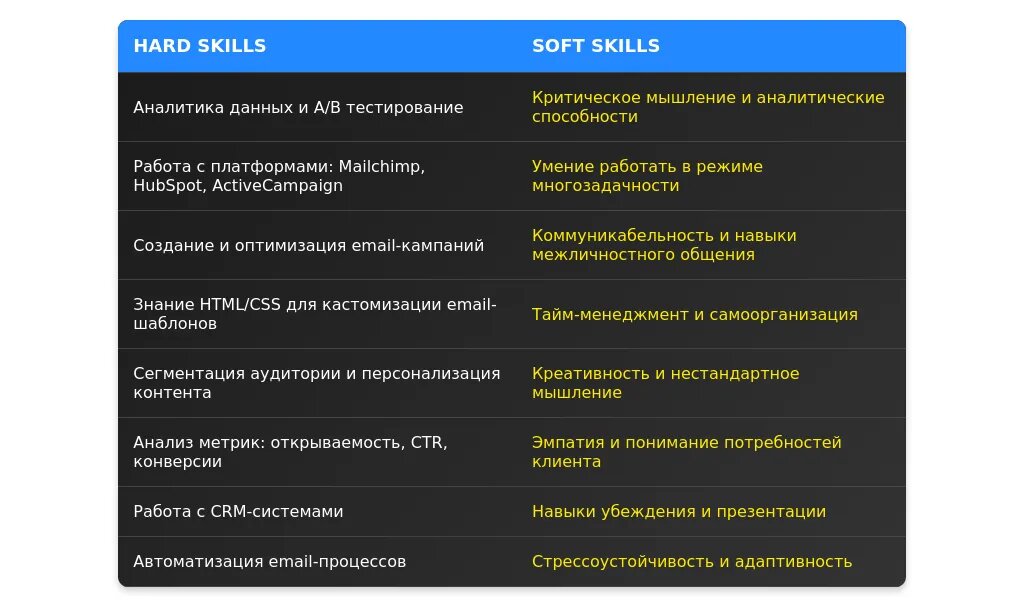 После адаптации: "Mailchimp, SendPulse, сегментация аудитории, A/B тестирование, HTML, CSS."