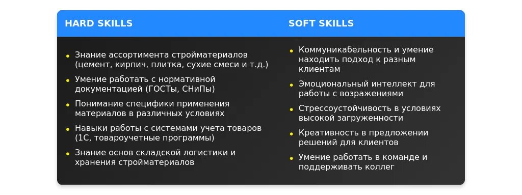 - Ключевые навыки, связанные с продажами и строительными материалами.