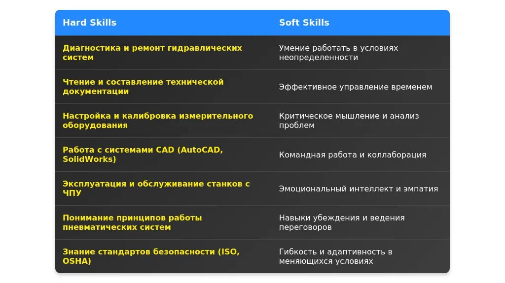 После адаптации: "Опыт работы с гидравлическими системами и промышленными роботами, навыки обучения персонала."