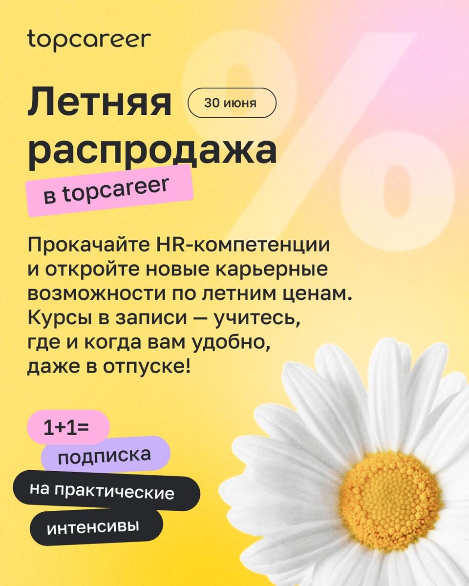 В topcareer начинается летняя распродажа. Время скидок и выгодных предложений. Мы отобрали лучшие флагманские курсы, курсы в записи, собрали практические боксы и приготовили их для вас под соусом из скидок до 50%, вам остается только выбрать и забрать свой.