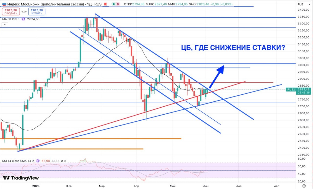 Интересная картина по технике 🤔 Рынок подошёл в плотную к тому, чтобы выйти из треугольника в котором был зажат долгое время. Снижение ставки было бы сильным драйвером для выхода вверх и похода на 3000 🤞 Экономика уже страдает, бюджет страдает, все ощущают давление ставки в 21%... И если ЦБ не заиграется и даст 1%-2%, то на рынке будет праздник 🤞🙏🥳