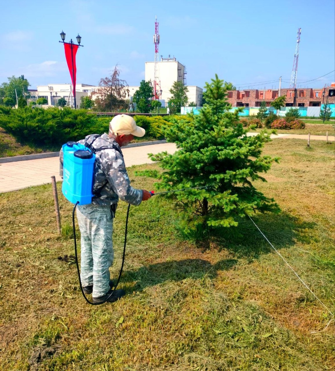 Сотрудники учреждения занимаются обработкой насаждений препаратом "Абига-Пик", а также обработкой межплиточных пространств и тротуаров препаратом "Гербицид" на территории мемориального комплекса.