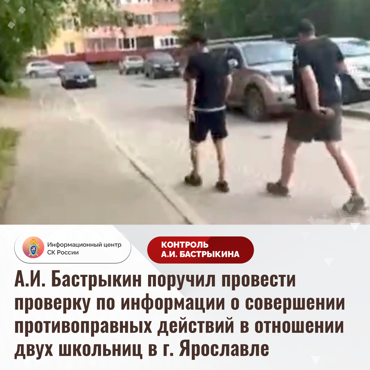 А.И. Бастрыкин поручил провести проверку по информации о совершении противоправных действий в отношении двух школьниц в г. Ярославле В сети Интернет сообщается, что в мае текущего года в городе Ярославле двое мужчин без причины избили школьниц вблизи многоквартирного дома. Председатель Следственного комитета Российской Федерации Александр Иванович Бастрыкин поручил руководителю СУ СК России по Ярославской области Александру Александровичу Бессмельцеву провести процессуальную проверку и представить доклад о ее предварительных и окончательных результатах. Исполнение поручения, а также ход процессуальной проверки поставлены на контроль в центральном аппарате ведомства. #СледственныйКомитет #СКРоссии #СКР #ИЦСКР #ИнформационныйЦентр #АлександрБастрыкин #ПредседательСКР #КонтрольПредседателяСКР #КомментарийКонтроль #ЯрославскаяОбласть