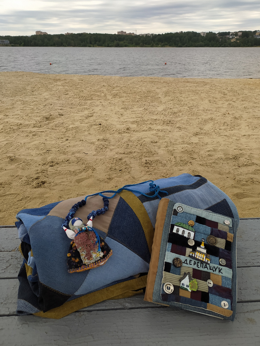 На золотом речном песочке под освежающим микроскопическим дождиком рядом со стеной благоухающей сирени, слушая шелест волн и крики чаек я фотографировала своë новое покрывало, сшитое из старых джинсов.