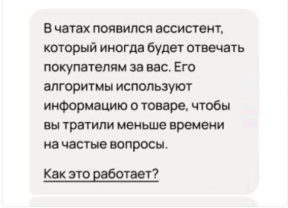 Как отключить ассистента Авито? Почитать, что такое ассистент можно здесь. 🙅♂️ Не всем нужна эта функция, многим она даже мешает. Благо пока её можно отключить! Инструкция по отключению элементарная: 1. В самом первом сообщении от ассистента будет фраза «Как это работает?»: 2. Нажмите на неё: откроется страница с информацией об ассистенте. Там есть возможность отключить ассистента и включить обратно:. P.S. Если не получается найти первое сообщение ассистента, чтобы отключить его или включить, напишите в поддержку Авито.