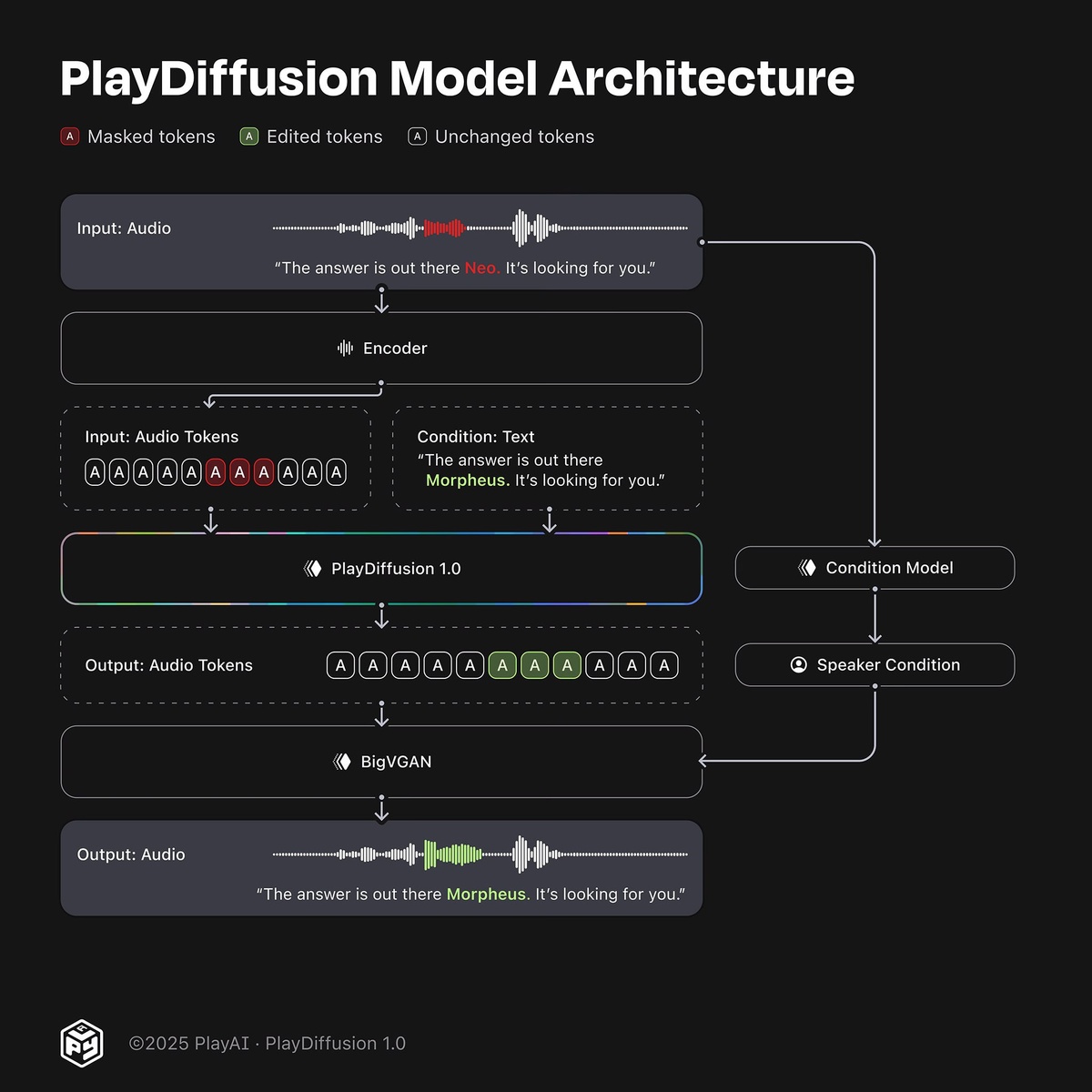 🌟 PlayDiffusion: инпейнт для речи. Те, кто работает с синтезом речи, знают, что авторегрессионные трансформерные модели, хоть и хороши для генерации речи из текста с нуля, но создают кучу проблем, когда нужно редактирование. Стандартные методы, в виде полной перегенерации предложения, обходятся дорого по ресурсам и часто приводят к изменению интонации или ритма. Замена отдельного слова обычно оставляет неприятные «склейки» на границах, а перегенерация с середины фразы может испортить уже существующую часть. Все это бьет по естественности и связности звучания. PlayAI выпустила PlayDiffusion 1.0 – диффузионную модель для редактирования речи, которая умеет изменять нужные участки аудио, сохраняя при этом общую гладкость и характеристики голоса. Причем модель пригодна как для реальной речи, так и для аудио, сгенерированного другими TTS-моделями. В PlayDiffusion аудиопоток кодируется в дискретное пространство, превращаясь в более компактную последовательность токенов. Затем, тот сегме