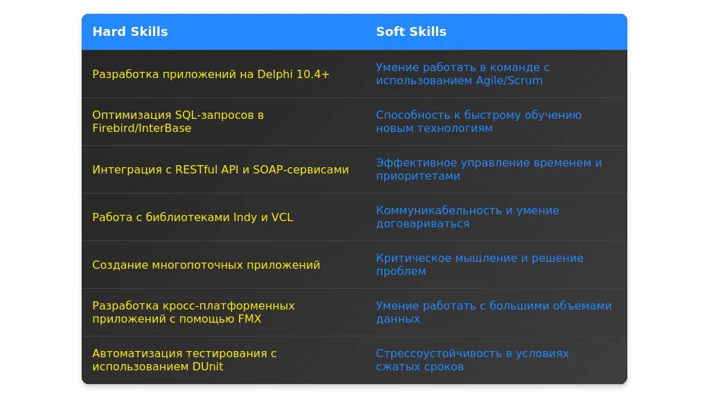 - Баланс навыков: Сочетайте глубокие знания Delphi с современными инструментами (Docker, CI/CD).