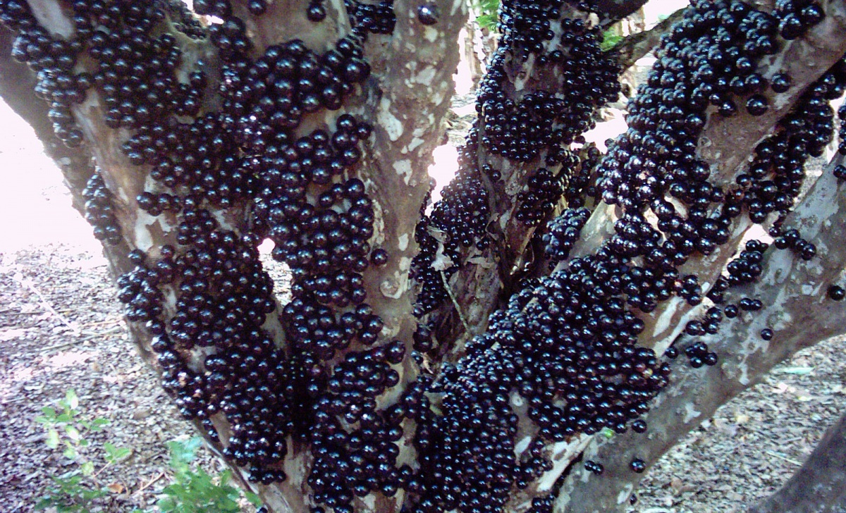 Дерево высотой до 12 метров, всё в чёрных ягодах размером с виноградины, но вместо привычных гроздьев – плоды густо облепили ствол и толстые ветки. Выглядит это зрелище как декорация к фантастическому фильму, где художники слегка заигрались с фантазией.