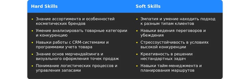 После: "Глубокое знание рынка косметики, опыт работы с крупными клиентами, навыки анализа продаж."