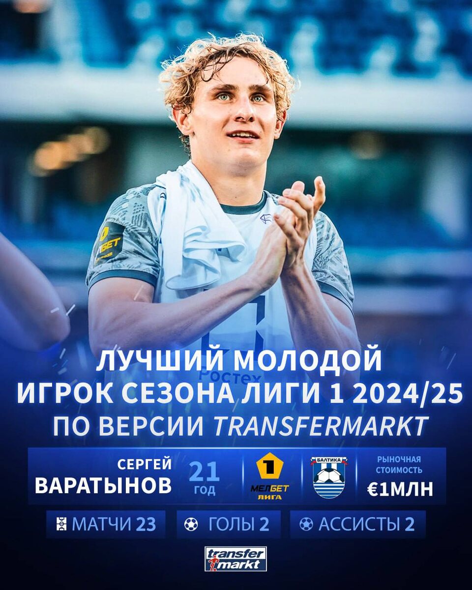 ⚽️ БАЛТИЙЦЫ В ЧИСЛЕ ЛУЧШИХ Портал Transfermarkt подвёл итоги сезона 24/25 в Первой Лиге — и наши парни в лидерах! ➡️ Кевин Андраде признан лучшим игроком сезона ➡️ Сергей Варатынов — лучший молодой игрок сезона Браво, Балтийцы! 👏 Давайте накидаем парням заслуженные 🔥!