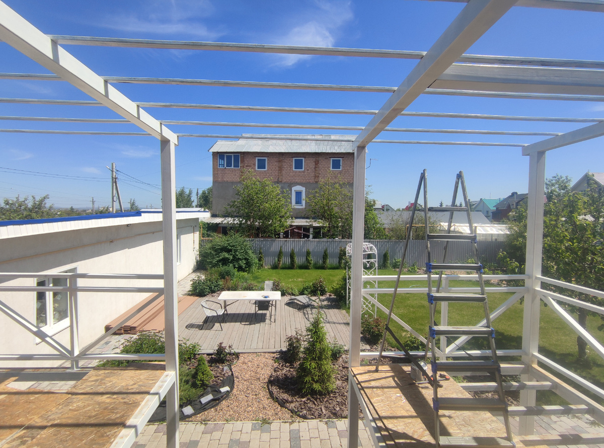 И вместо застеклённой веранды решили сделать открытую террасу. Вооружившись сварочным аппаратом, кучей профильных труб была сварена металлоконструкция, которая по своей фундаментальности и количеству потраченного (с запасом и перестраховкой) металла дала фору знаменитой мехозилле Илона Маска.