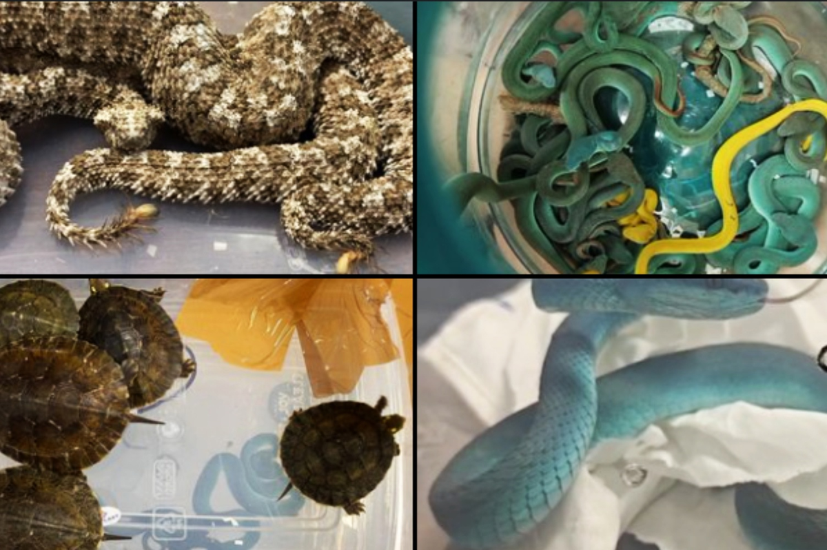 На фотографиях из аэропорта можно увидеть множество бирюзовых ямкоголовых гадюк, извивающихся в ведре, а также рогатых гадюк с хвостами в виде пауков. К сожалению, к моменту вскрытия багажа была обнаружена одна мертвая змея. Контрабандист теперь будет отвечать за свои действия согласно закону.