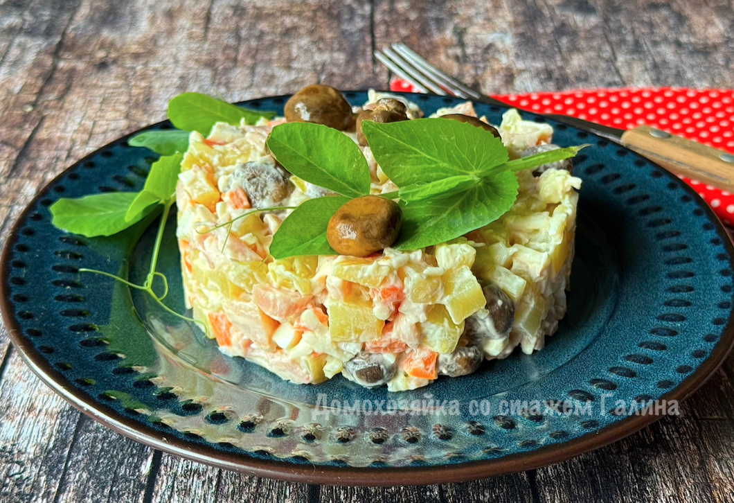 Состав этого салата многим знаком — я и сама часто готовлю блюда с похожими ингредиентами, будь то слоёный салат или перемешанный. Но, как вы уже знаете, я иногда заглядываю в отдел кулинарии в супермаркетах — вдруг наткнусь на интересный вариант? Мне не сложно, а кому-то может пригодиться. После первой дегустации я задумалась: а что, если чуть изменить рецепт? Всё было вкусно, но мне хотелось чего-то особенного. Я отложила часть салата и внесла несколько небольших, но важных правок: добавила пару новых ингредиентов, которые усилили вкус и придали салату новую глубину. И знаете что? Салат действительно заиграл новыми красками — стал ярче, сочнее и интереснее! Так что в этой статье вас ждут сразу два варианта: классический и мой авторский. Надеюсь, оба пригодятся, и вы приготовите их для своих близких! У меня были совсем маленькие шампиньоны — я их почистила, промыла и выложила в сухую разогретую сковороду. Разрезать не стала, так как размер позволял обойтись без этого. На среднем огне