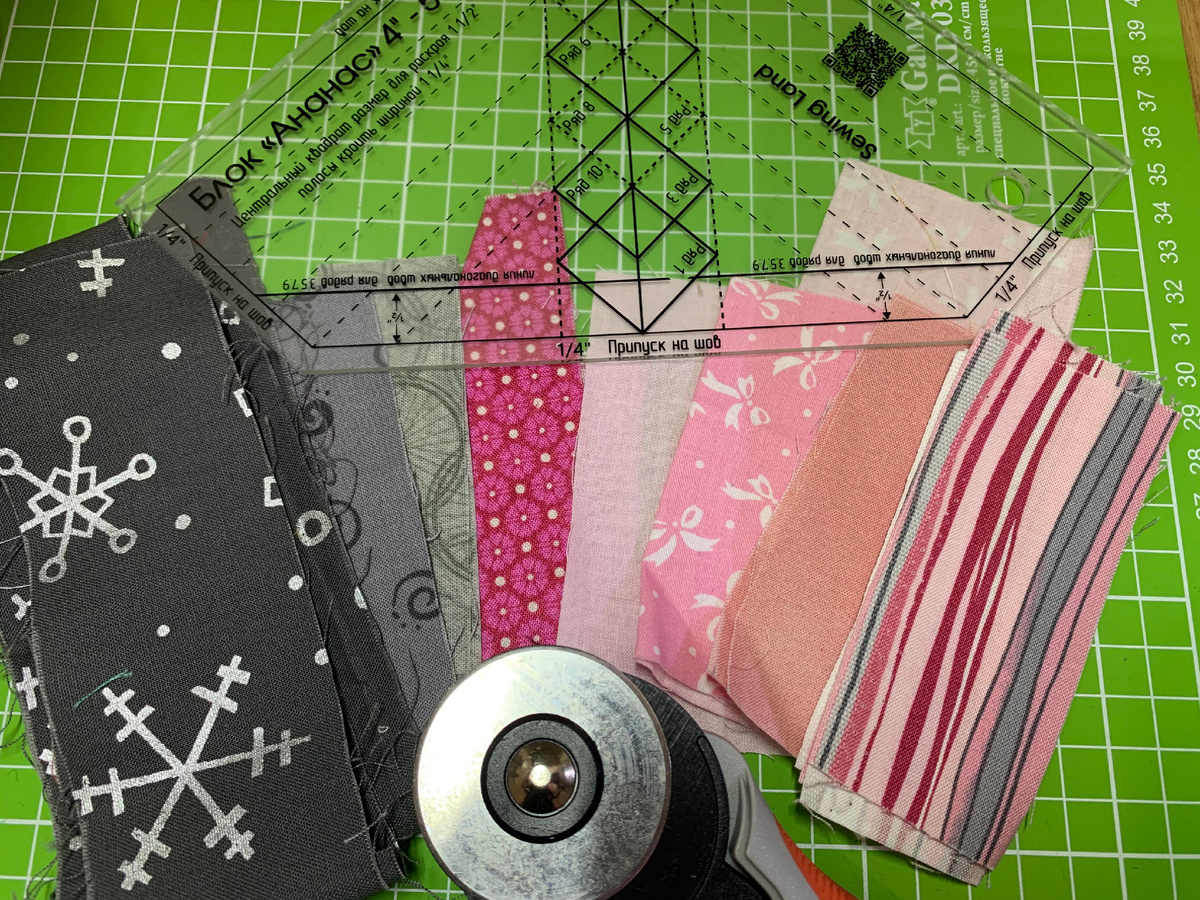 Продолжаем учиться пользоваться линейкой для блока «Ананас». Обзор возможностей блока здесь: Первый способ шитья по специальной линейке рассмотрен здесь: Итак, второй вариант для нас известен также под названием «Русский квадрат». Сшить его можно конечно же и без линейки. Например, этому посвящён один из уроков в Академии лоскутного шитья: Однако мы хотим извлечь из нашего хобби максимум удовольствия, и разнообразные «облегчалки» на в этом помогают. Начало блока как и в 1 варианте - квадратик размером 1 1/2 дюйма (примерно 3,8 см). Полоски рекомендованы шириной 1 1/4 дюйма (примерно 3 см). Я выбрала для блока розово-серую гамму. Первый этап: также пришиваем первый ряд полосок с четырёх сторон, попеременно. Напоминаю, что очень важно соблюдать постоянный припуск, в данном случае это 1/4 дюйма, или 6,3 мм. Затем помещаем центральный квадрат в окошечко с названием «Ряд 1». Срезаем излишки по ровной стороне линейки. Повторяем операцию со всех сторон. Получилось так: Пришиваем второй