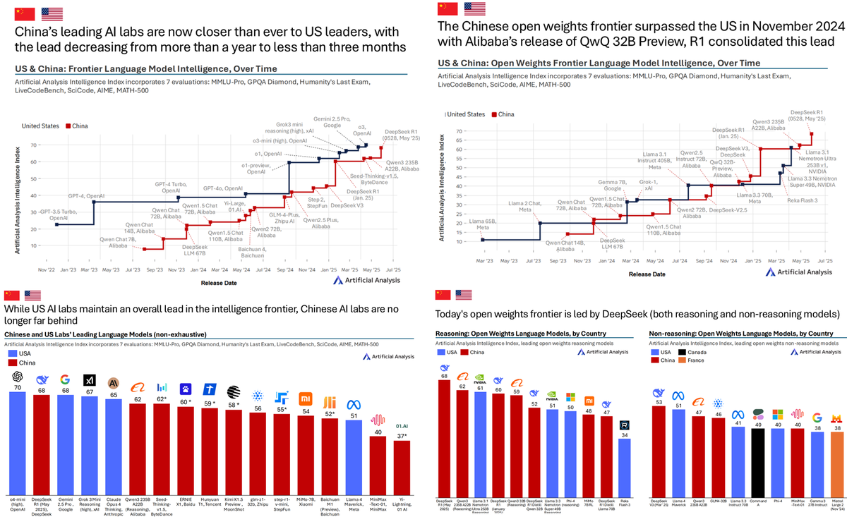 Удушающий захват экспортного контроля не удался Вышедший вчера отчет State of AI: China Q2 2025 аналитической компании Artificial Analysis на цифрах подтвердил недавно сказанные досадливые слова 1-го человека в мире по «железу» для ИИ Дженсена Хуанга, что «экспортный контроль США действительно провалился». Китай догнал США по самым мощным ИИ в мире (левые 2 диаграммы на приложенной картинке) и перегнал по самым мощным ИИ с открытыми весами (правые 2 диаграммы). История этой гонки такова. · Осенью 2022 США в схватке с Китаем за первенство в ИИ «сменили дзюдо на бразильское джиу-джитсу». США назвали 35 ключевых «технологий удушающей хватки» способных в 21 веке убить будущее любой страны. И №1 в этом списке технологий был ИИ. · Той же осенью в ответ на самый страшный удушающий прием США - экспортный контроль на передовые чипы и оборудование для их производства, - Китай ответил не так, как СССР или Россия. У нас будет не импортозамещение – решило руководство Китая, - а научно-техническое