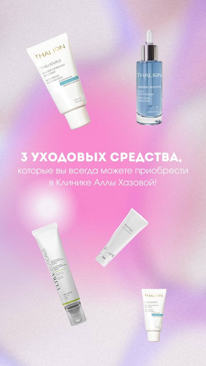 ТОП 3 СРЕДСТВА которые всегда можно приобрести в клинике Аллы Хазовой 1. Mineral Booster от Thalion — живительная сила минералов ✨ Преимущества минерального бустера: ✅ Глубоко увлажняет и укрепляет защитные свойства кожи. ✅ Ускоряет процесс регенерации тканей, улучшая эластичность и упругость. ✅ Обеспечивает мягкость и шелковистость, сохраняя естественный баланс влаги. 2. Ultraceuticals SPF 30 Cream — защита и уход круглый год ✨ Основные преимущества крема: ✅ Эффективная защита от солнца SPF 30 ✅ Легкая текстура, мгновенно впитывается, не оставляет следов ✅ Подходит для всех типов кожи, включая чувствительную ✅ Создает бархатную поверхность, идеальную основу под макияж 3. Крем Thalisource от Thalion — источник молодости и энергии ✨ Что особенного в креме Thalisource? ✅ Интенсивное увлажнение, придающее коже гладкость и упругость. ✅ Антиоксидантная защита от свободных радикалов и воздействия окружающей среды. ✅ Улучшение тона лица, выравнивание рельефа и уменьшение признаков старе