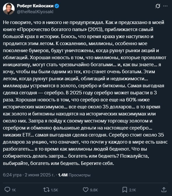 Автор книги "Богатый папа, бедный папа" считает, что именно этим летом рынок акций и облигаций обрушится. Особенно тяжело придётся бумерам: миллионы просто сгорят. Но есть и хорошая новость — кто успеет, тот может разбогатеть. Кийосаки говорит, что капитал хлынет в реальные активы: золото, биткоин и особенно серебро. Что ж, готовимся.