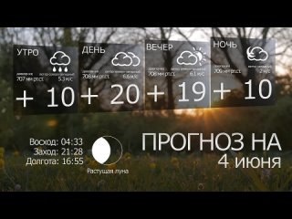 По данным Башгидромета, 4 июня на территории республики ожидается облачная погода с прояснениями. Местами кратковременный дождь, гроза. Ветер западный 5-10м/с, при грозе порывистый. Температура воздуха ночью +6,+11°, днем +20,+25°. На автодорогах ночью и утром местами туман, видимость 500-1000 м. Видео от Учалинская телерадиостудия «УчалыТВ» Источник https://uchaly102.ru/?p=85060