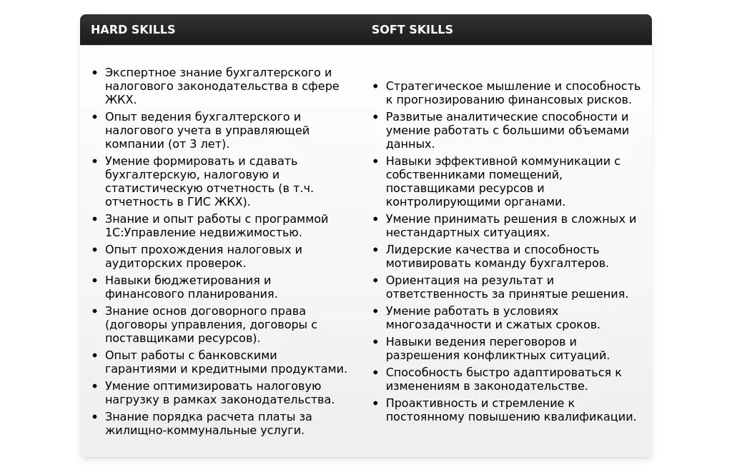 - Что обязательно включить:Ключевые навыки и компетенции, релевантные должности главного бухгалтера в управляющей компании.