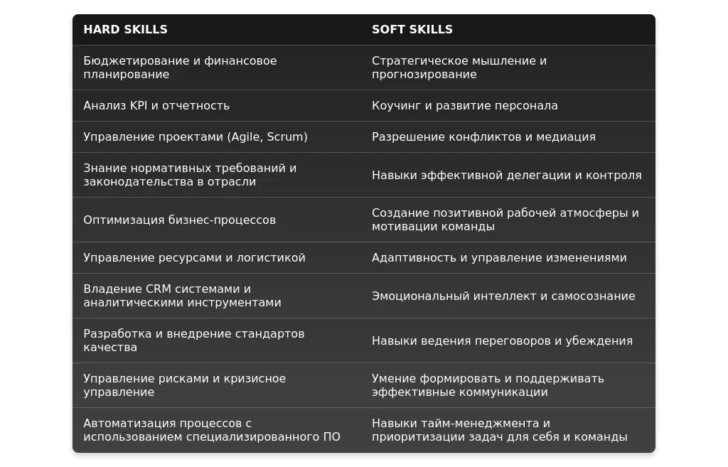 - Скрытые: Коммуникабельность, умение мотивировать команду, умение решать конфликтные ситуации.