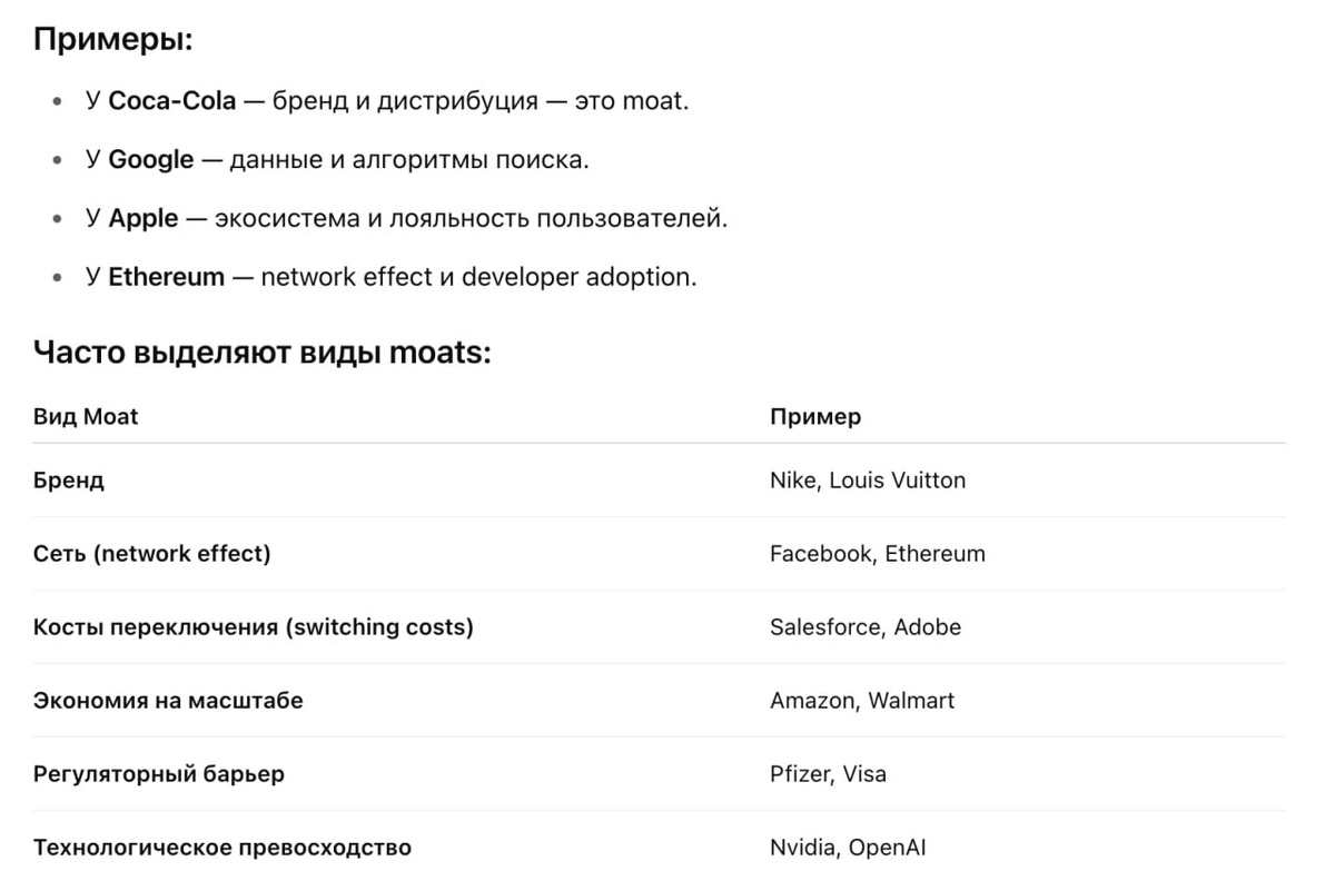 Слово "moat" (в переводе с английского — «ров») в бизнесе и инвестициях означает «устойчивое конкурентное преимущество» компании. Это метафора: как ров защищает замок от врагов, так и moat защищает бизнес от конкурентов. В стартапах Если инвестор пишет: “Interesting, but doesn’t look like it has a moat” это значит — легко скопировать, нет защиты от конкурентов. Если пишут: “Strong moat” это значит — есть защита, сложно повторить, бизнес может долго доминировать.