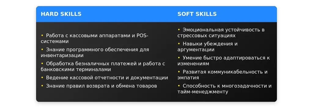 Ключевые фразы: "ведение кассовой отчетности", "обслуживание клиентов", "работа с POS-терминалами", "решение конфликтных ситуаций".