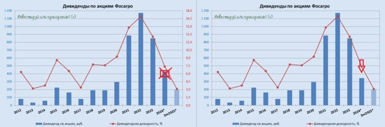 💰 Менее предсказуемой компанией, чем Фосагро, в плане дивидендной логики, является разве что Газпром, от которого в последние годы можно ожидать чего угодно. Но если проблемы у газового монополиста сейчас прослеживаются невооружённым глазом, то в случае с Фосагро всё выглядит как осознанная стратегия — игра в дивидендные качели на грани фола. Компания, которая ещё пару-тройку лет назад считалась эталоном предсказуемости среди дивидендных аристократов, теперь напоминает самое настоящее казино, где акционеры каждый квартал гадают: сорвут ли они на этот раз условный джекпот или же в очередной раз останутся с носом? 😡 Особый цинизм ситуации придаёт то, что компания продолжает заигрывать с акционерами, предлагая выбор там, где его быть не должно. "Хотите 171 рубль? Или, может, 87 рублей?" — этот вопрос звучит как издевательство после того, как акционеры трижды подряд выбирали минимальный из предложенных двух вариантов, в надежде, что акционеры скажут: "Спасибо, что не ноль!" Если бы Фосаг