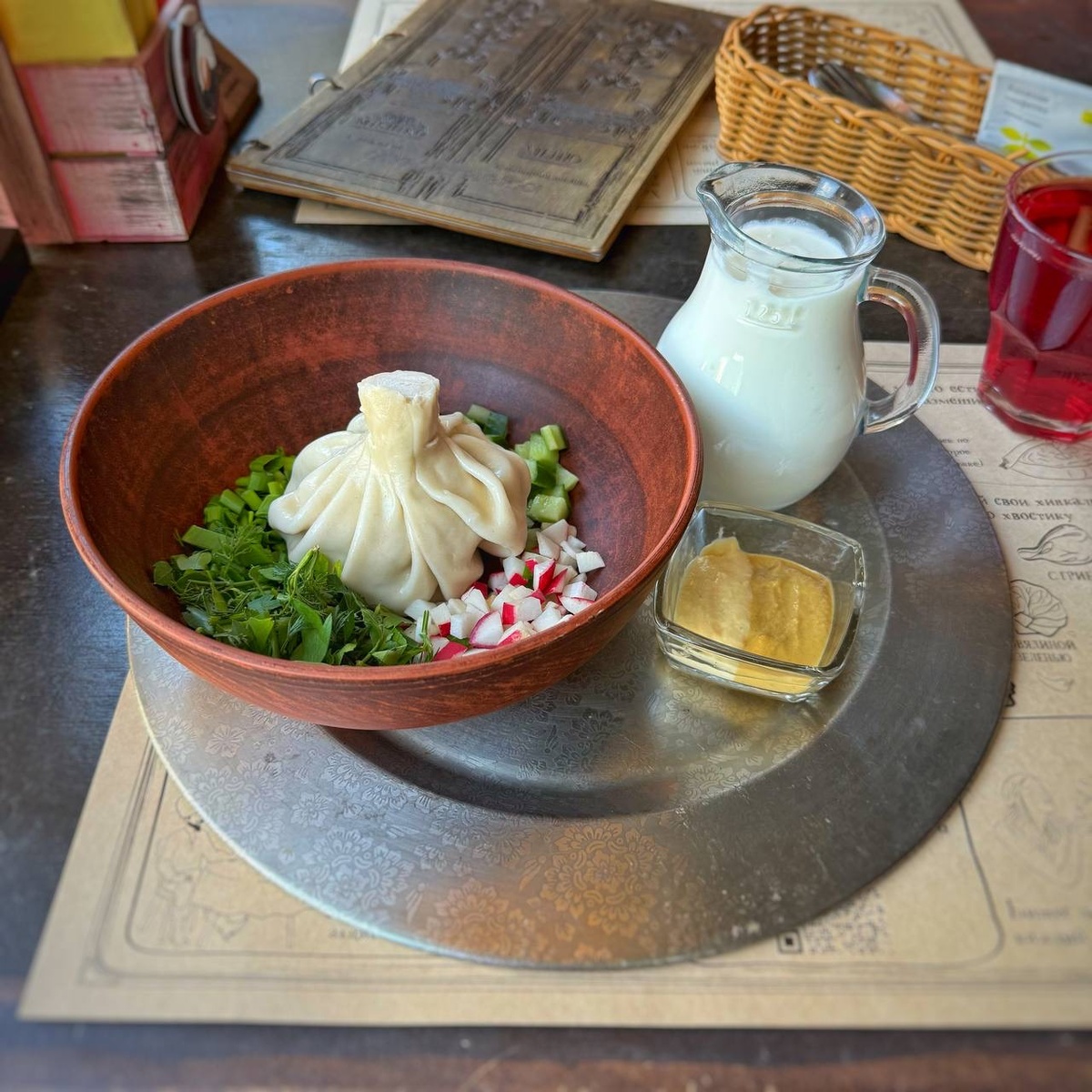 Окрошкиндали из летнего меню грузинского ресторана Mishiko по 420 ₽. Открыл сезон окрошки самой необычной окрошкой, которую я пробовал, если не считать северо-корейский вариант — кукси. Окрошкиндали — это сумасшедшая фантазия, объединившая хинкали и окрошку. Блюдо можно заказать с квасом, а можно с мацони. Если бы не обзор, взял бы с квасом. Для меня окрошка только когда с квасом. Со всем другим — просто холодный суп. Приносят окрошкиндали на металлическом подносе. Отдельно тарелка с начинкой, мацони и добавки: хрен и горчица. В центре тарелки большая хинкалина, а вокруг порезанные редис, огурец и зелень. Внутри хинкалины тёплая начинка: картофель, мясо и яйцо. Разрываешь хинкалину, выкладываешь начинку. А тесто можно съесть. Залил мацони, посолил, поперчил, добавил весь хрен и немного горчицы. Попробовал — вкусно! Пожалел только, что не взял к окрошке хлеб пури. Вышло бы еще вкуснее. Блюдо — многоуровневый аттракцион. Если придумали его сами, то это однозначные 10 из 10. И дело