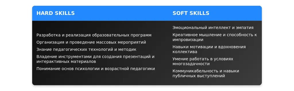 После: "Эффективная работа в команде, организация мероприятий для детей, разработка образовательных программ."