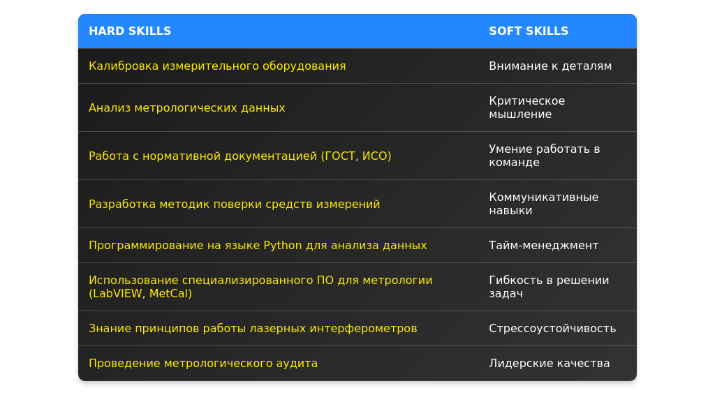 В резюме инженера по метрологии важно выделить как технические (hard skills), так и личные (soft skills) навыки. Вот что особенно ценится работодателями: