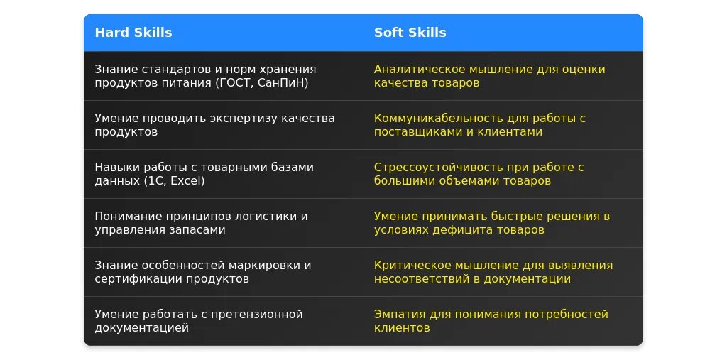 Пример 2: В описании указано, что товаровед должен уметь анализировать рынок. Скрытое требование: навыки работы с большими объемами данных и аналитическое мышление.