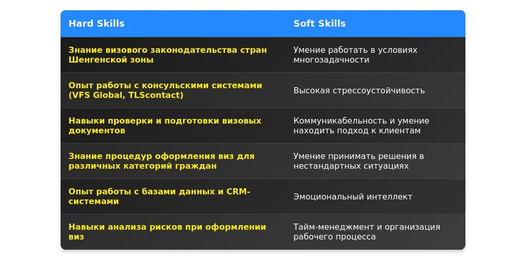 После адаптации: "Знание визового законодательства стран Шенгенской зоны, опыт работы с CRM-системами, английский язык на уровне Upper-Intermediate."