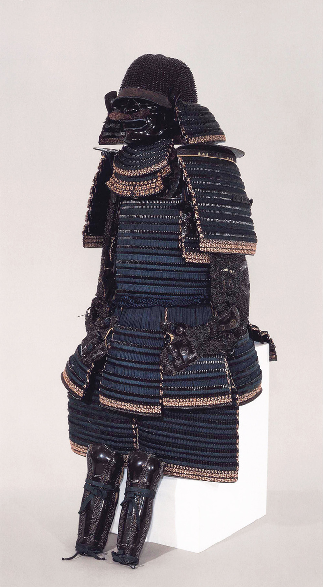 Этот прекрасный комплект доспехов был изготовлен для Иэмицу, внука первого сёгуна Токугава, который сам стал сёгуном в 1623 году. Этот тип доспехов известен как тосэй-гусоку, буквально "современное снаряжение", и был стандартной броней, использовавшейся в XVI веке. Кираса плотно облегает тело и застегивается с правой стороны. Кираса, юбка, набедренная повязка, наплечники, защита горла, а также защита шеи и плечевого пояса, прикрепленные к шлему, состоят из лакированных железных пластин, соединенных рядами шелковой тесьмой. Несмотря на лёгкость, доспехи этой конструкции обеспечивали хорошую защиту от режущего оружия, сохраняя при этом подвижность владельца. Шлем состоит из шестидесяти четырех вертикальных пластин с выступающими заклепками, из-за которых ему дали название "звёздный шлем" (хоси кабуто). Строгий вид этого доспеха свидетельствует о бескомпромиссном духе боевой подготовки, который Иэясу прививал своим преемникам. Именно Иэмицу завершил политику изоляции и ввел систему поо