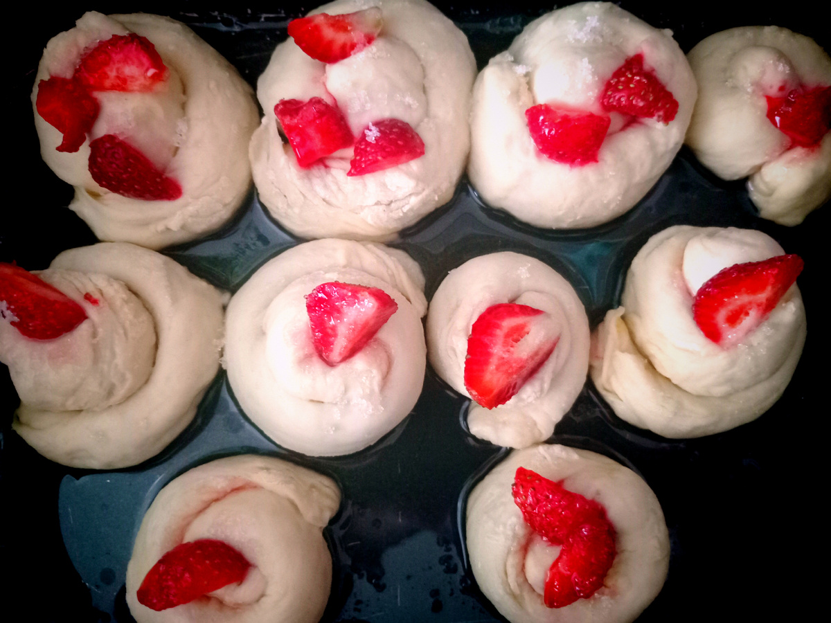 Я все таки сделала несколько булочек из остатков теста. Итак : Готовое дрожжевое тесто, Сахар, Клубника. Приготовление : Тесто разделила на несколько шариков. Каждый шарик скрутила в жгут. И закрутила в спиральки. Сверху посылала сахаром и положила по дольке клубники. И запекла при 180', в течение 30 минут. Булочки во время запекания увеличились в размере и получилась вот такая красота чаю. Мягкие, вкусные, с запахом клубники 😋😋😋