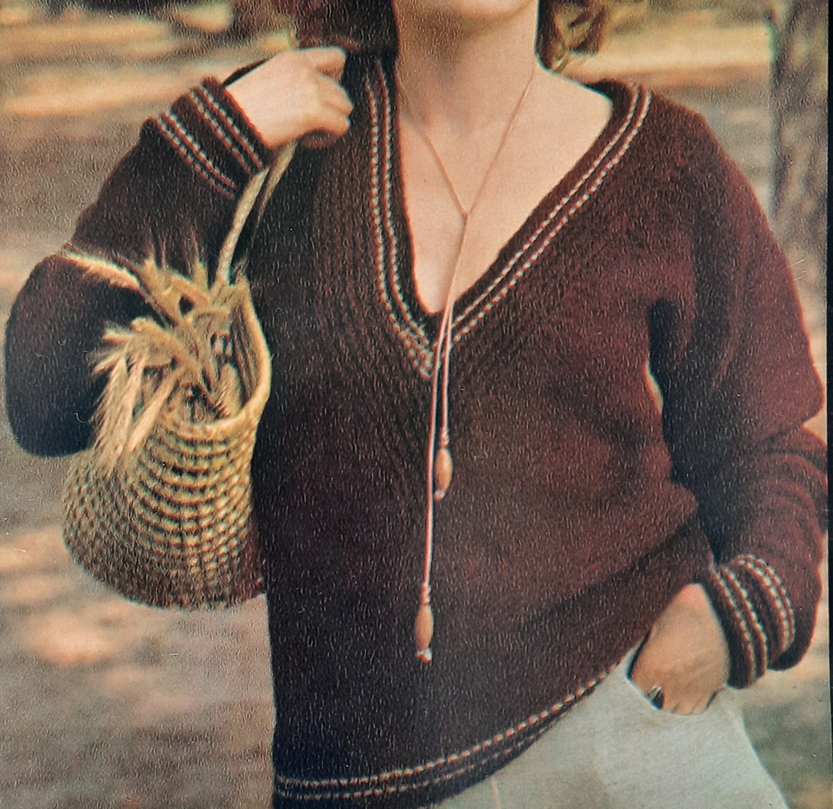 Размер 46-48. Шерсти: 600г коричневой и 30г беж. Спицы 3;5. Основное вязанье- чулочное(лиц.р.- лиц.п.,изн.р.- изн.п.) Горловина, манжеты и низ модели - платочное вязанье (все р.- лиц.п.). Узкие полосы из беж.ниток- это ряд лиц.п.,провязаный по изн.стороне пуловера.