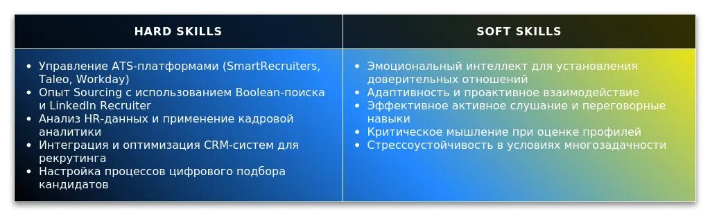 Навыки: "Активный поиск кандидатов, оценка профессиональных компетенций, эффективное ведение переговоров, использование CRM-систем."
