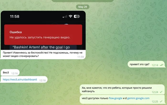 Мне только задали вопрос про сайт, который якобы даёт доступ к Veo3 от Google. Человек искал Veo3, и нашёл русский сайт с якобы доступом этой видео-модели (не он мошенник, он чуть не попался, найдя в Яндексе красивый сайт типа с Veo3). Я тоже видел такие сайты сразу после премьеры Veo3 (!) — и хочу предупредить: У Veo3 нет публичного API, и официальной версии на доменах .ru быть не может. Veo3 доступен только через flow.google и gemini.google.com, и только при условии подписки (от $20) и американского Google-аккаунта. То есть обманывают через сайты или боты! Такая же ситуация была с громкими проектами вроде Higgsfield и старой-доброй Sora. Исключения есть только для некоторых нейросетей, которые работают через геймерский мессенджер Discord (например, Midjourney) — но это скорее редкость, а не правило. Если где-то и появляется нейросетка за пределами официальных сайтов, то только на площадках вроде fal.ai (у них действительно в день премьеры может быть) или replicate — но только если у