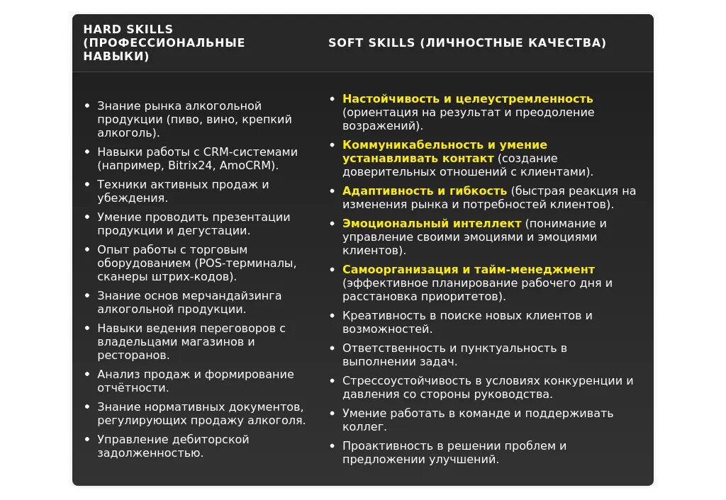 - Что обязательно включить:Ключевые навыки, релевантные для должности торгового представителя (алкогольная продукция).