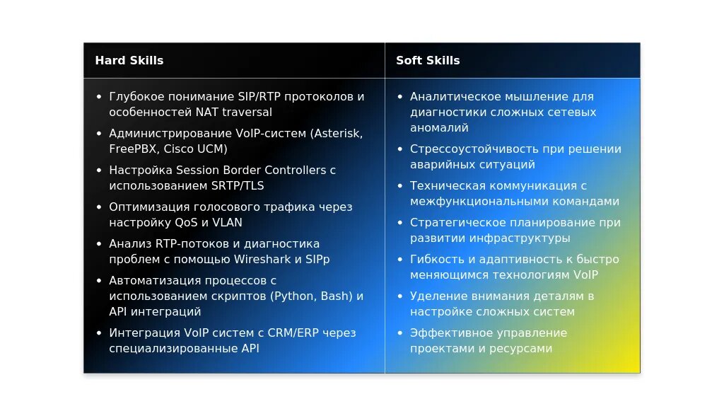 После: "Глубокие знания протоколов SIP и H.323; опыт настройки и обслуживания VoIP-систем; умение анализировать и оптимизировать сетевую инфраструктуру."