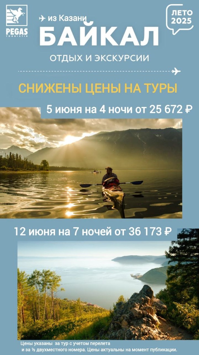 Байкал 🤗 🌳🌺🌼 активное цветение и буйство красок на Байкале с конца мая до середины июня!🌷🌸🪻 Представьте, как одновременно расцветает липа, сирень и жасмин, как меняется пейзаж, когда расцветает багульник! Давно хотели попасть на Байкал? 🤩 Не упустите возможность - сейчас снижены цены на туры на 5, 12 и 16 июня! ✈️ Летим на Байкал наслаждаться красотой на бескрайнее озеро и зеленые склоны. Туры на Байкал по специальной цене: 5 июня на 5 ночей от 26 672 ₽ 12 июня на 7 ночей от 36 173 ₽ 16 июня на 7 ночей от 43 677 ₽ ✅ _В стоимость тура с вылетом из Казани на человека включено: авиаперелёт, размещение в 2-х местном номере.