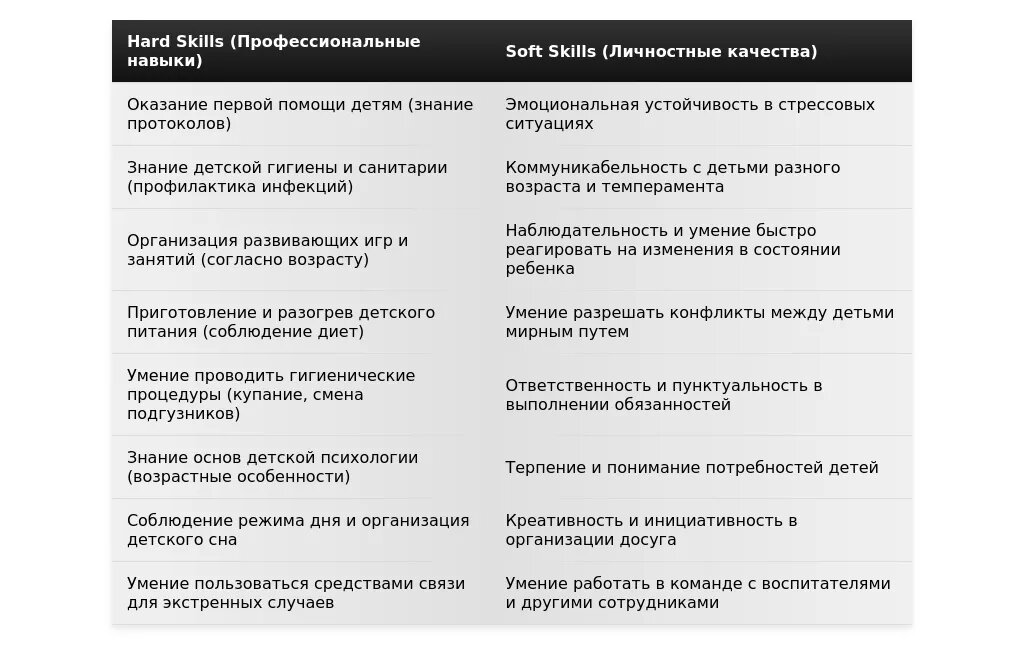 - Перечислите ключевые навыки и качества, необходимые для работы няней в детском саду (например, ответственность, терпение, любовь к детям).