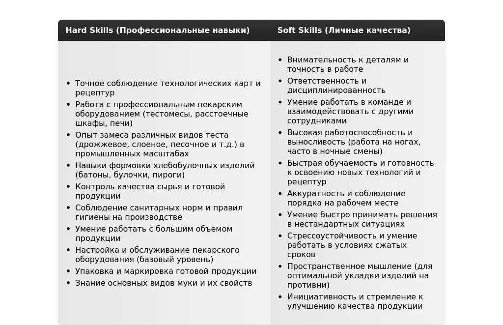 Анализ: Ключевой навык – знание технологии заморозки теста. Важны личные качества, такие как ответственность и умение работать в команде.